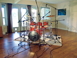 Dalam studio rakaman Microphone diletak ke setiap alat drum untuk menangkap bunyi yang akan dirakam masuk kedalam mixer & multitrack atau digital recorder.