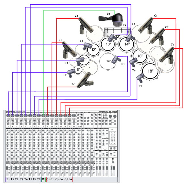 | Microphone placement (di mana letaknya microphone) untuk drum yang masuk mixer & keluar dari PA ke loudspeaker |